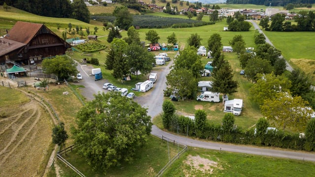 Unser Campingplatz besteht aus einer grossen, parzellierten Wiese mit Bäumen zur Beschattung und einigen befestigten Standflächen für grössere Wohnmobile.